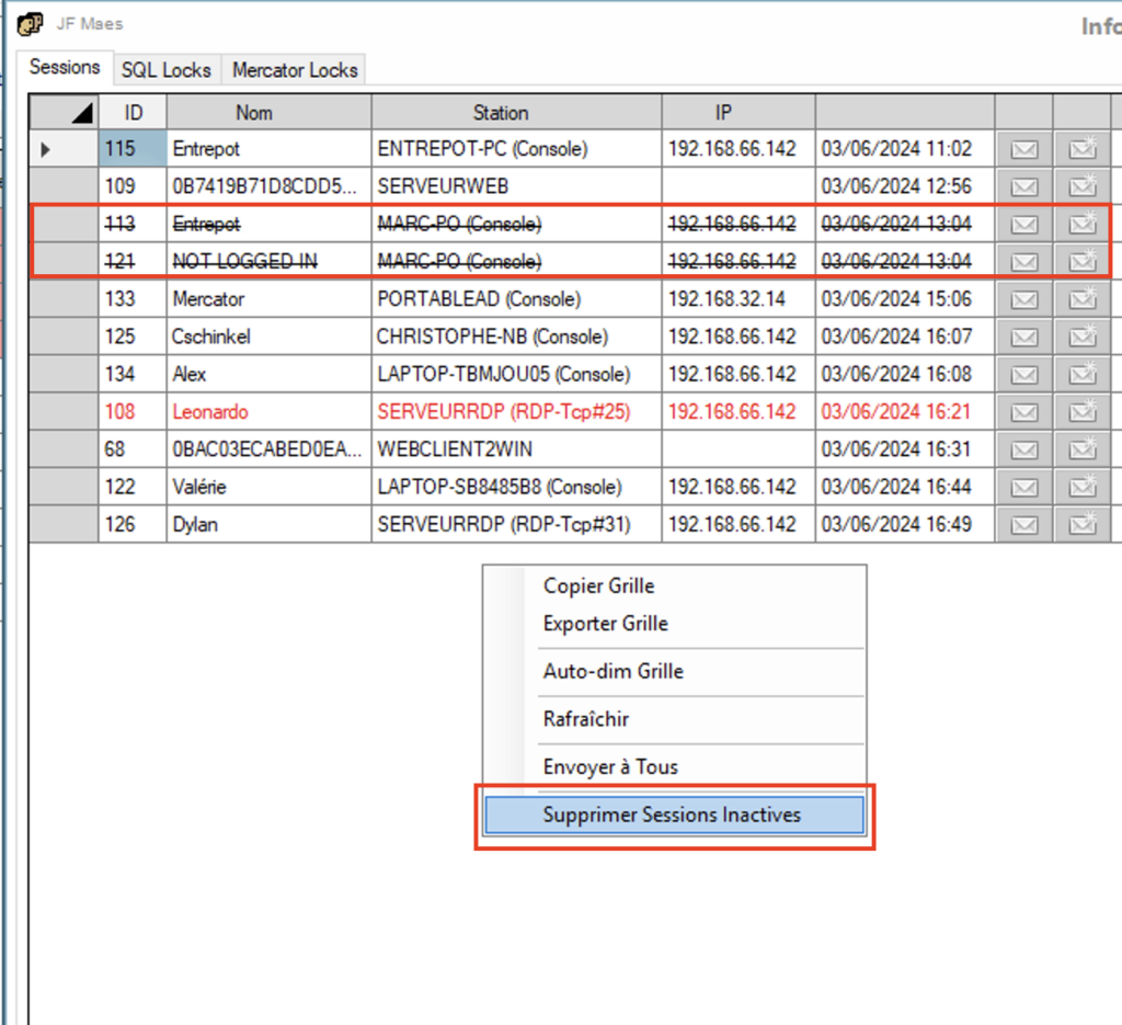 - Clic droit sur une zone blanche –> Supprimer Sessions Inactives.