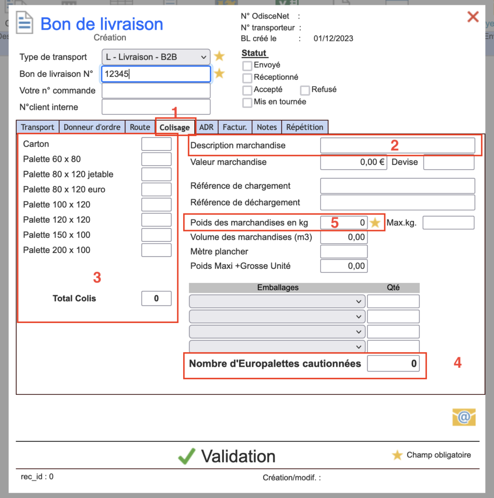 - Total Colis: indiquer le nombre de carton total sur la/les palettes