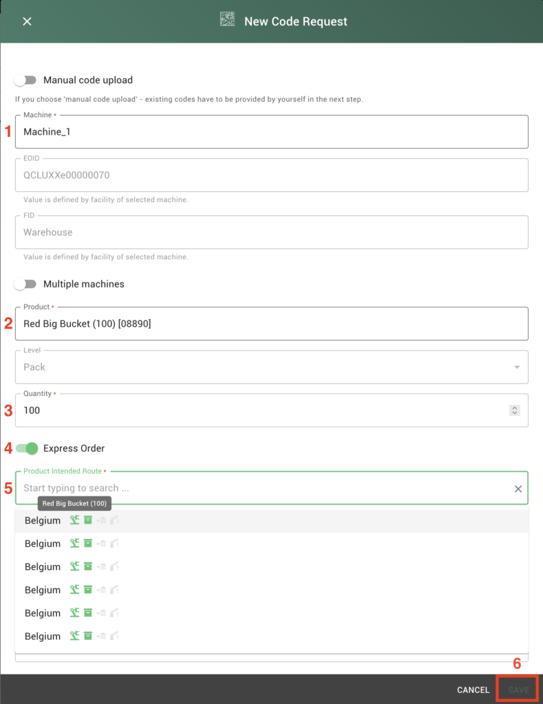 - Product: Choisir l’article pour le quel les QR codes doivent être commandés