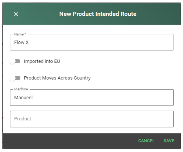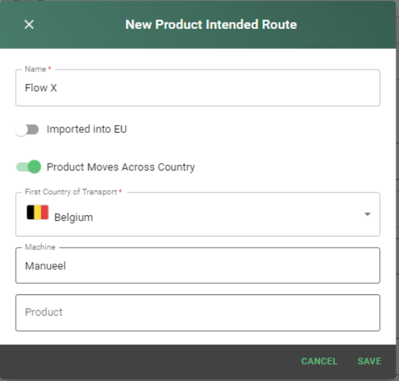 - Product Intented Route*: Si la route n’existe pas pour le produit, taper un nom manuellement puis la créer. Dans l’exemple il s’agit du Tabacig 100 en seaux pour la Belgique.